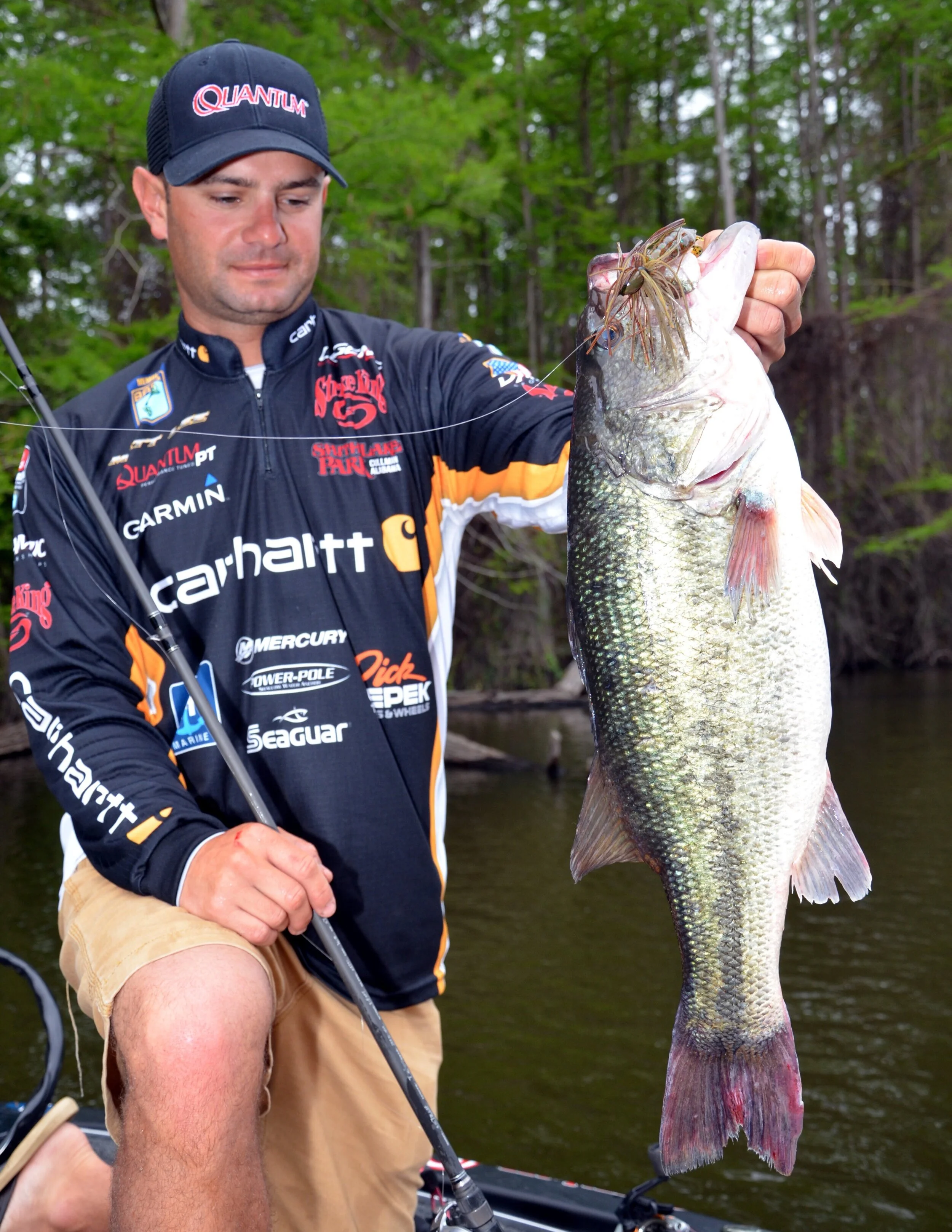 Kevin VanDam, a four-time Bassmaster Classic champion from Kalamazoo, Mich., admires a bass he caught on a topwater bait while fishing at Toledo Bend Reservoir on the Louisiana-Texas line near Many, LA. (Photo by John N. Felsher)
