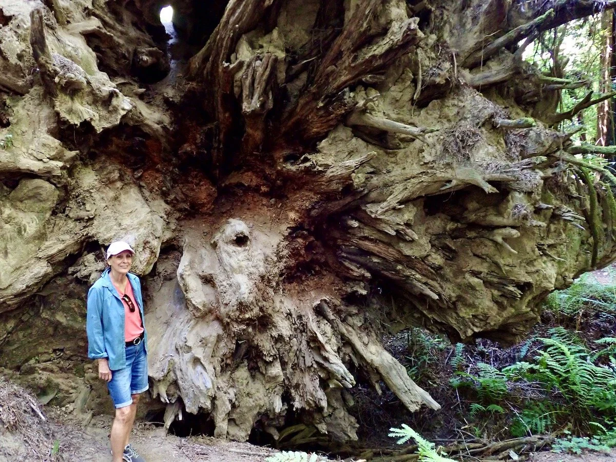 Susan stands by the exposed roots of a blown-down redwood in Humboldt Redwoods State Park.