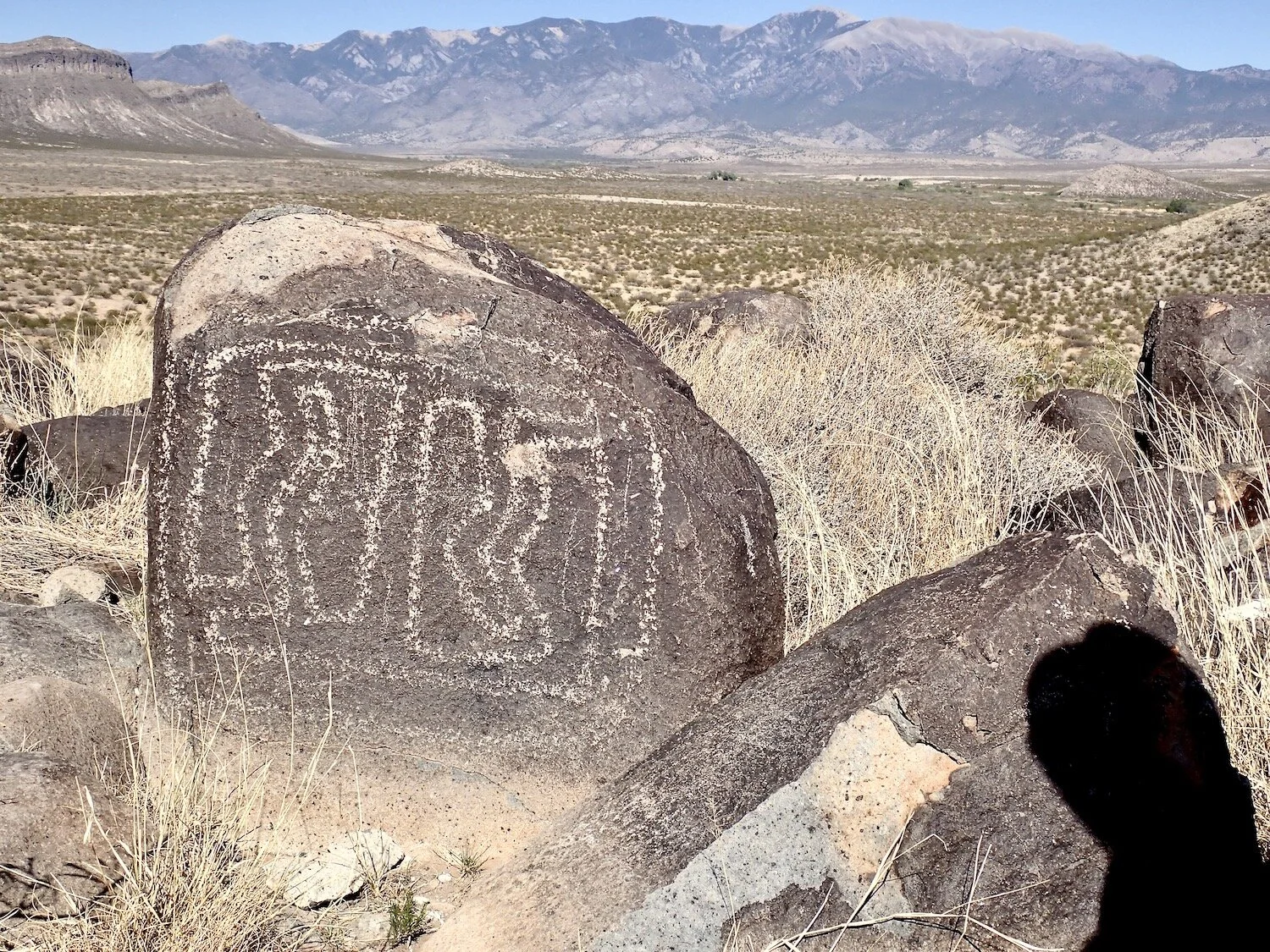 A petroglyph at Three Rivers Petroglyph site. The Sacramento Mountains rise in the background. John Kumiski