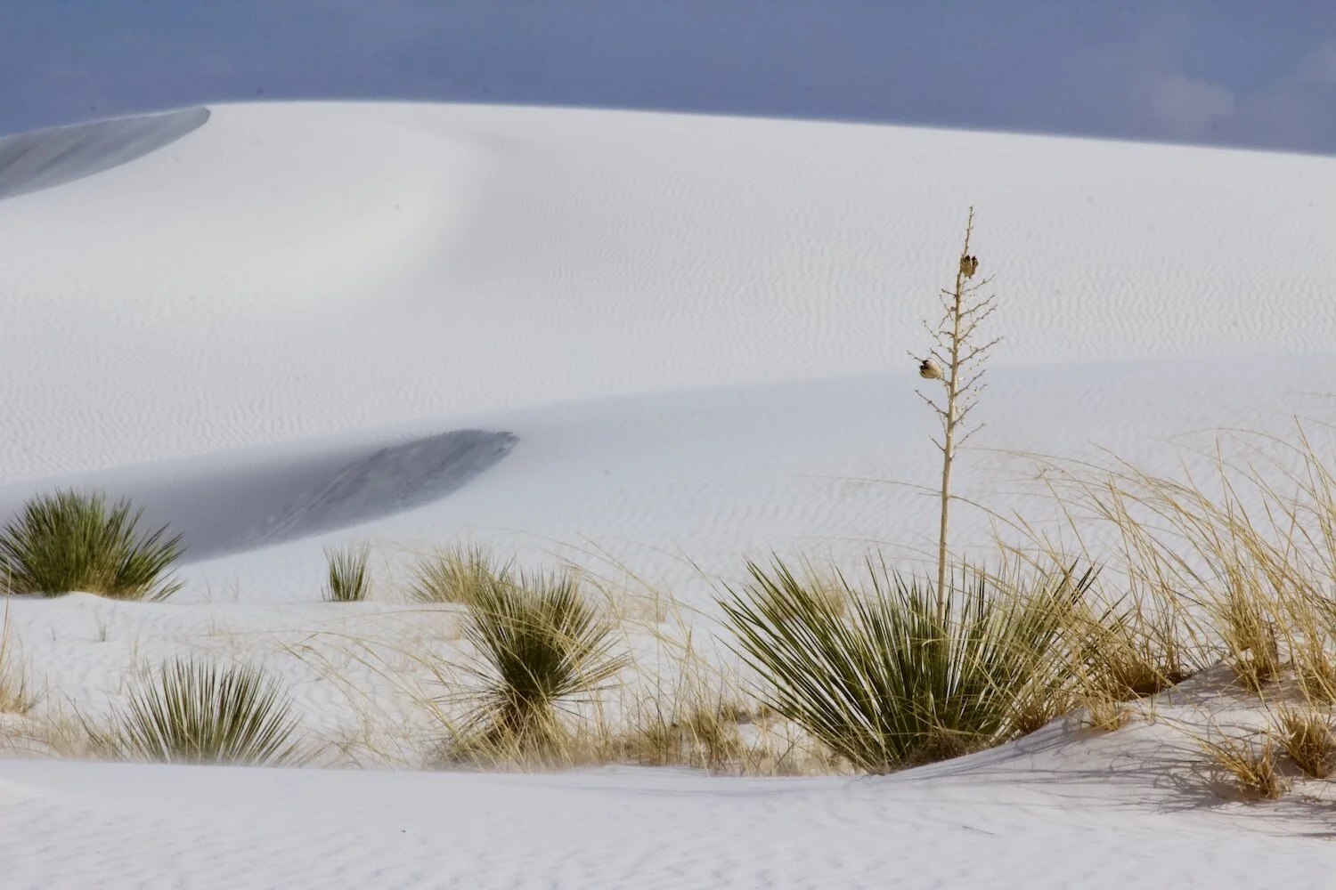 Living things fight to survive in the dunes at White Sands. The yuccas, those spiky plants, one of which displays a flower stalk, do quite well. John Kumiski