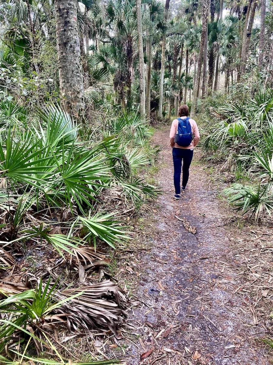 Susan hiking the nature trail at Hontoon Island State Park